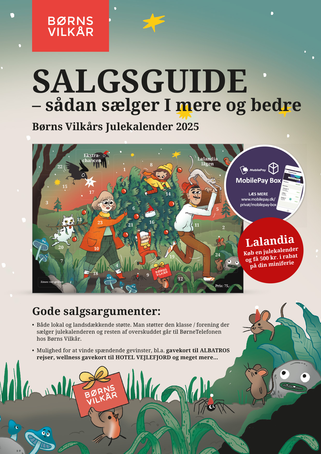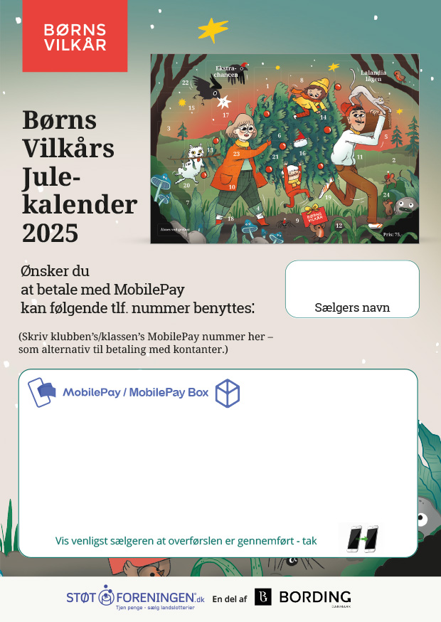 Sammen med julekalenderne modtager i salgsguide, MobilePay kort, brugsvejledning, plakater, folder som fortæller om Børns Vilkår’s og BørneTelefonen’s, samt stickers til at sætte på sælgernes tøj.